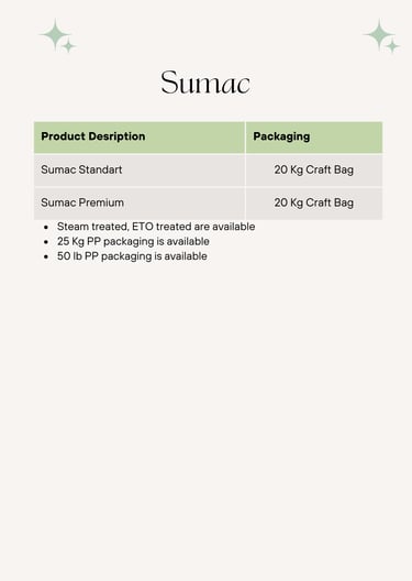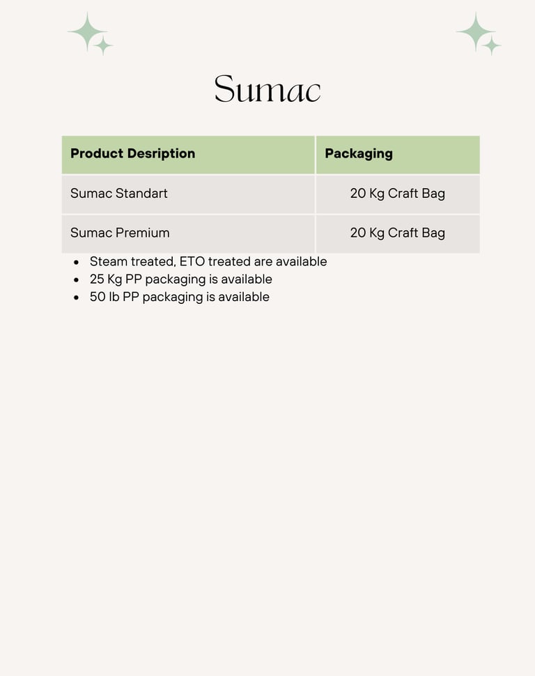 Sumac's unique flavor profile makes it an essential spice in many kitchens, particularly for those who enjoy Middle Eastern and Mediterranean flavors. Whether used as a seasoning, garnish, or primary ingredient, sumac brings a burst of citrusy brightness to any dish, making it a favorite among chefs and home cooks alike.